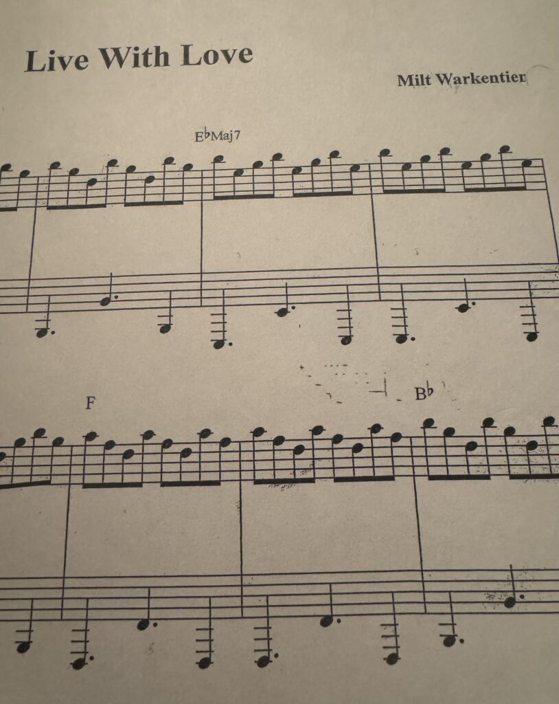 “Live with Love” was written for one of my niece’s wedding. The piano part represents God in our life, always present and never changing. Each instrumentalist, ad libs their part, other than the piano, representing different people in our lives and how we must listen to each other to be able to live in harmony. Conflicts will arise, just as tonalities may suspend over each other, but by listening to each other and living with love in our hearts we might be able to create beautiful harmonies and sounds.