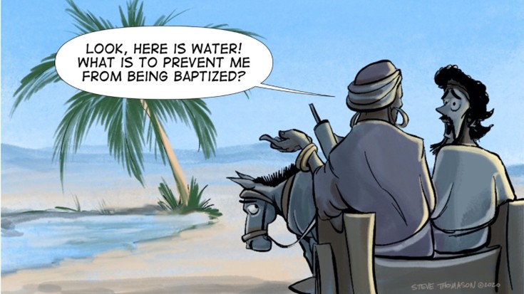 The eunuch takes the initiative and asks the rhetorical question, “What is to prevent me from being baptized?”