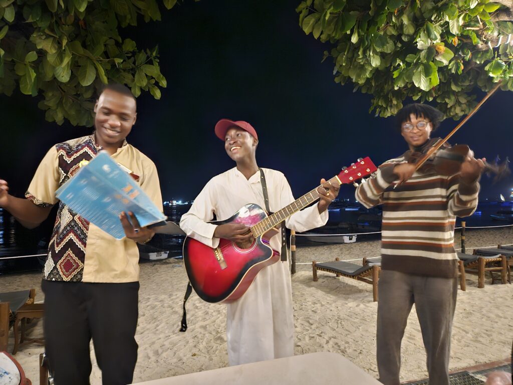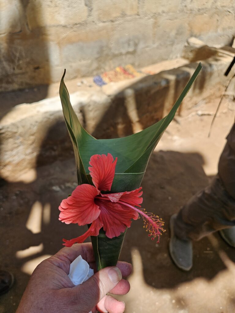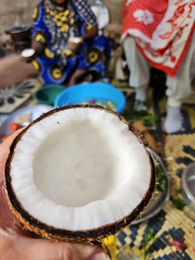 Zanzibar is known for its spices. Our excursion today brought us to the Jambo Spice Farm, where our first event was a cooking class. The location was a traditional Tanzanian kitchen area. We learned how to peel and slice produce and spices, and how to extract coconut milk. The meal prep included rice pilau, curry, fish, chicken, greens, green banana and plantains. While the meal was cooking we took a walking tour of the farm and saw many spices and fruits. We saw a tree climbing demonstration and received hats, handbags and jewelry woven from palm branches and hibiscus. After the tour it was time for lunch so that we could taste the food we helped prepare. Delicious, and sure gave us a new appreciation for the effort involved! After lunch we had oranges, pomelo, watermelon, baby bananas and red bananas.